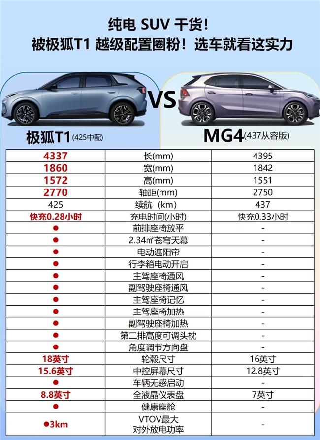 总之,极狐T1凭借其卓越的电池安全、健康的座舱环境和宽敞的空间表现,在同级市场中脱颖而出。相比MG4,极狐T1在多个方面展现出了明显的优势。6.88万起的预售价极具吸引力,不仅配置更高、性能更优,服务网络也更加广泛。如果你正在寻找一款性价比高、品质可靠的纯电车,极狐T1绝对是你的不二之选。赶紧入手吧,早买早享受!