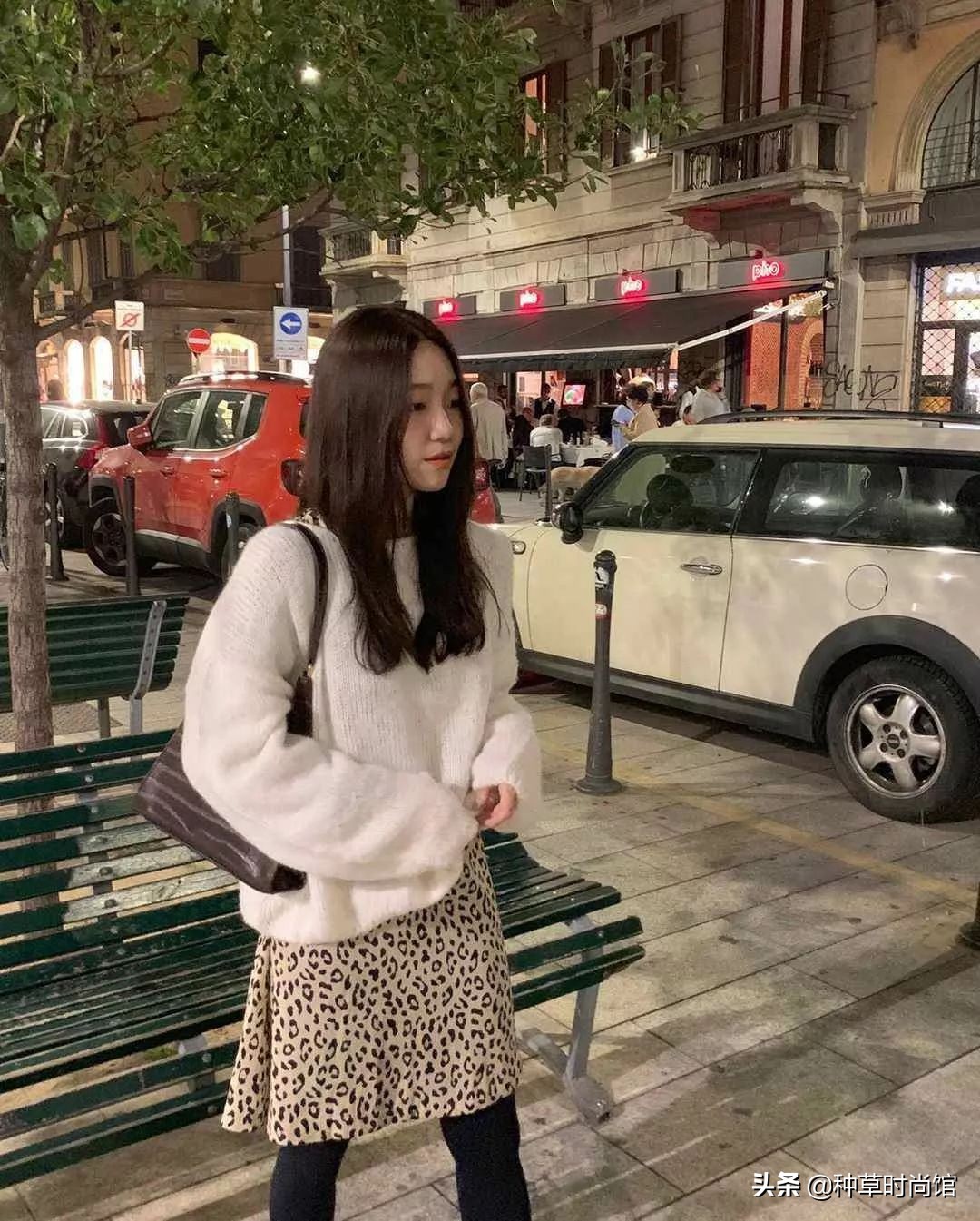 白色毛衣+豹纹裙摆,既纯洁又不羁,层次特别丰富,搭配腋下包,显得更加时尚。